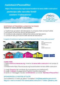 Per proseguire questo cammino entusiasmante “la tana delle costruzioni” chiede il supporto dei suoi amici e ha ideato una Raccolta Fondi per trasformare gli esterni del laboratorio in un’opera d’arte sempre fruibile, rinnovare la memoria storica, contribuire alla redazione dell’archivio storico e contribuire alla promozione delle numerose attività.