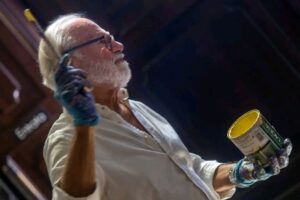 Cuore della sua sperimentazione è una tecnica pittorica originale definita antidripping, che prevede un controllo rigoroso del gesto e del lancio della vernice. Ogni impulso diventa una traccia irripetibile, frutto di un equilibrio precario tra casualità e intenzione. Una gestualità che richiama idealmente il coup de fouet dell’immaginario Liberty, in dialogo con le teorie della fisica quantistica, in particolare il ruolo dell’osservatore nel determinare il fenomeno.