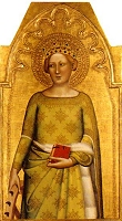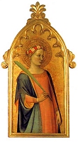 S. Caterina d'AlessandriaSymposium di santi – Santa Cecilia icona della sezione Fondi oro, donata al Museo Diocesano dal prof. Alberto Crespi nel 2000, è posta all'estremità sinistra del Polittico del Carmine e le fa da contrappunto, all'estemità opposta, la tavola raffigurante Santa Caterina d'Alessandria, proveniente da una collezione privata. Le figure delle due sante sono accomunate dall'eleganza e dalla dolcezza dei volti, nonché dall'armonia e semplicità nobile della resa dei particolari delle vesti, della ghirlanda di fiori di Santa Cecilia, e di gemme preziose incastonate in una corona d'oro di Santa Caterina. A fianco di Santa Cecilia, si trova la tavola raffigurante San Bartolomeo, proveniente dalla Galleria dell'Accademia di Firenze, così come la tavola pendant con San Lorenzo dal lato opposto. I santi sono riconoscibili dagli elementi iconografici che li contraddistinguono: il coltello per san Bartolomeo, il suo martirio consistè nell'essere scorticato vivo, e la graticola per san Lorenzo, il quale offrì a Dio, il supplizio di essere arso vivo. Bernardo Daddi lo rappresenta, come diacono con la dalmatica ed in mano il libro dei salmi.