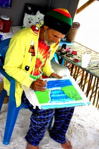 Vedo un rastaman dalla lunga vita vissuta che sta dipingendo in riva al mare, con la schiena adagiata sul legno ricurvo di un’enorme palma.