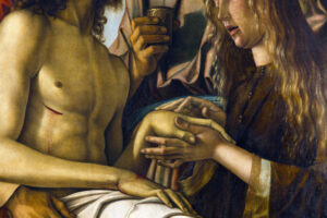 scuri, guida l’occhio passando dalle gambe di Cristo abbandonate sul sepolcro alla ferita del costato ed è lì che si concentrano anche tutti gli sguardi dei personaggi.