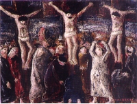 Tensione esistenziale – Da allora e fino alle sue ultime opere che serbano ancora una innata impostazione monumentale anche quando sposta la sua attenzione dal sacro allo studio di interni, dal chiuso dell'atelier e dalla sua modella, alla vastità del paesaggio, rimane la sua cifra, quella della "memoria della solitudine e di una tensione esistenziale intimamente sofferta", come ebbe a scrivere di lui, alcuni anni fa, Silvana Aldeni. La sofferenza di un artista che ha conosciuto il lato poetico, il lato ludico, ma anche quello osceno della vita, quello della guerra e della povertà, e di quello ne ha serbato a lungo il ricordo. Trasferendoli con sovrana naturalezza nell'iconografia cristologia.