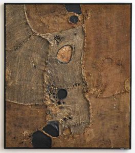 Alberto Burri ha iniziato a dipingere mentre era prigioniero negli Stati Uniti , durante la seconda guerra mondiale Laureato in medicina si è poi deicato alla pittura dedicandosi a ricerche astratte utilizzando materiali particolari come sabbie, catrami, pomice e smalti che diventranno un linguaggio di rinnovamento nella poetica informale. Nel 1951 partecipa alla fondazione del gruppo romano Origine. Inizia la serie di cicli che segneranno pagine della storia dell’arte. Si ricordano I Neri, i Gobbi dove la superficie del dipinto viee deformata da protuberanze con l’inserimento, dietro il telaio, di rami nodosi; le Muffe, i Sacchi (i primi risalgono al 1950), le Combustioni (1957), i Ferri (1958), i Legni (1959) fino alle Plastiche degli anni ’70 ottenuti dalla manipolazione di materie artificiali. Tutti i materiali si fanno “colore” sulla tela. l collage, le lacerazioni, le cuciture, le bruciature si presentano in una immagine tanto drammatica e violenta quanto poetica. Caratterizza gli anni ’70 anche la serie dei Cretti, dalle vaste superfici screpolate, e dei Cellotex. Una progressiva tendenza alla monumentalità caratterizza la sua produzione dalla fine degli anni Settanta, a partire dai cicli pittorici, fino alle grandi sculture in .