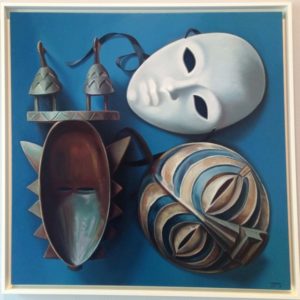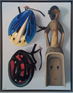 «La maschera che dipingo oggi è un vuoto, il casco è un vuoto … li ho visti vicino e ho pensato: guarda che strano, si assomigliano! Hanno la stessa forma ovale, ancestrale, che ricorda un volto. Il casco si mette sul capo, ma sembra una maschera da guerra, una protezione del viso con delle feritoie medievali.
