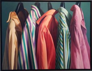 «Accade anche con la camicia che è vuota, ma si riempie d’aria, di forme, di colore, è appesa sulla gruccia … in essa si vede l’essere umano, ma nella sua assenza, nel suo essere quasi un fantasma. E’, però, un fantasma affascinante, perché c’è il colore, ci sono le righe … Da questo è nato il mio stile espressivo: rappresento il vuoto che lascia l’essere umano nell’uso dei suoi oggetti, in particolare l’abito. Naturalmente ci sono molte “infiltrazioni” in quest’idea, perché noi siamo italiani e abbiamo alle spalle una tradizione molto importante. Penso, ad esempio, al Rinascimento, dove i panneggi sono quasi più importanti del volto dei personaggi».