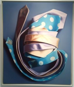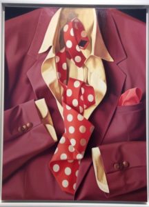«Prima ho portanto avanti il discorso degli abiti e diventando anche ironico. Ho fatto delle composizioni che giocano sulle forme delle cravatte, sulle spirali. Ho provato degli accostamenti sia disordinati che molto classici. Ed è stato bello. Ho dipinto l’abbigliamento maschile perché è un po’ cosmico, una divisa».
