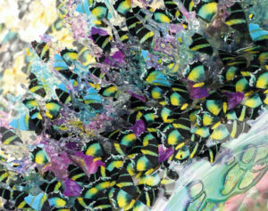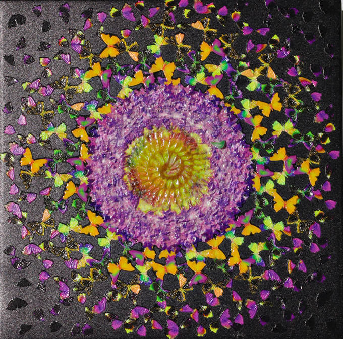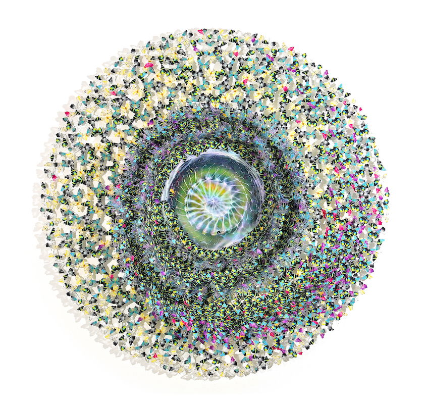 Tra le sue opere più iconiche e suggestive, i Dreamcatcher che sembrano frutto di un’esplosione, “un’esplosione che però non deflagra fino a disperdersi – scrive Angelo Crespi nel testo curatoriale – la forza centrifuga impressa trova infatti un bilanciamento nella forza centripeta, così lo sguardo è costretto a muoversi tra il fuori e, riprecipitando, il dentro, in un continuo sforzo tra concentrazione e dissipazione, un moto oculare esasperato dal vorticoso procedere degli elementi che si tengono in fragile equilibrio, farfalle e foglie, nel colore prima intenso, verso il centro, e poi ai bordi sempre più rarefatto”.