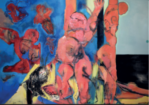 stessi, come è in fondo l’obiettivo stesso della pittura. Negli ultimi anni, è stato per me naturale confrontarmi soprattutto con i due temi della Crocifissione e della Deposizione, temi in cui sono i corpi degli uomini ai piedi e sulla croce a creare il movimento e il pathos che reggono il fulcro del simbolo della cristianità. Nei miei quadri non c’è la croce, risulta dissolta nei colori, ma i corpi hanno mille forme, non hanno più i vestiti e le fattezze del passato, ma reggono la contemporaneità e tutto ciò che ne comporta. È importante che siano qui, ai piedi del Sacro Monte, all’inizio del cammino della Fede, informi nel segno pittorico, ma pronti a trasformarsi negli occhi e nei cuori di chi guarda, così come ci si trasforma dopo aver percorso il sentiero in salita che ci conduce alla cima.”
