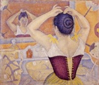 P.Signac, Donna che si pettina', 1892Manifesto e fine del movimento – Dopo la morte dell'amico, Paul Signac diventa il principale rappresentante del pointillisme. L'espressione artistica acquista dinamismo, fino ad arrivare a sfiorare la pratica dei Fauves. Georges Seurat muore improvvisamente nel marzo 1891, ma non senza aver dato al suo movimento un manifesto: Una domenica alla Grande Jatte (1884-1886). In mostra è presente La Seine à Courbevoie, uno dei tanti studi per la grande opera, in cui Seurat applica tutte le regole del colore secondo le teorie che aveva fatto proprie. Con una riproduzione di quest'opera si chiude la mostra, ma con una curiosità: il visitatore è chiamato a partecipare all'interpretazione collettiva dell'opera, posando sulla traccia grafica del dipinto un pallino adesivo colorato, ovvero il proprio 'puntino' cromatico.