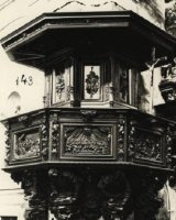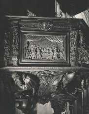 Pulpito, particolareaffermando la tendenza a risolvere con forme schiettamente architettoniche i manufatti lignei (altari, mense d'altare con tabernacoli, casse d'organo, cantorie, porte ecc., che altrimenti si sarebbero potute realizzare in marmi, pietra, muratura con stucchi ecc.), specie per il determinante impulso del Bernasconi, artista di multiforme attività.