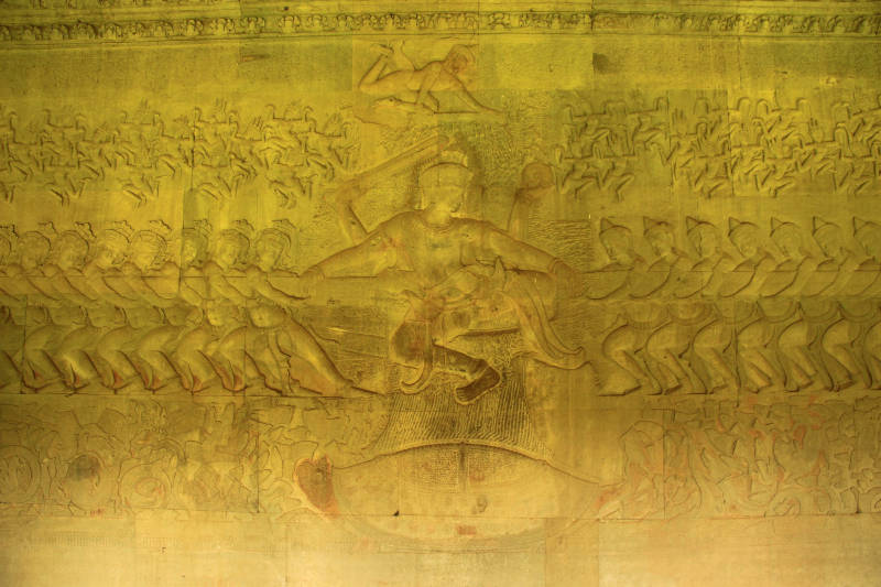 Al culmine della scalinata un bassorilievo enorme mostra il mito cosmogonico, di tradizione induista, “dell’Oceano Latteo”, narrato nel Ramayana e nel Mahabharata, che racconta la battaglia degli Ashura e dei Deva (angeli e demoni), impegnati a tendere per la testa e per la coda, in un curioso tiro alla fune metaforico, il serpente Vasuki, avvolto a spirale attorno al monte Mandera. Si tratta della vetta centrale delle cinque del Monte Meru, asse dell’Universo nonché unico sperone di terra che emergeva dall’Oceano di Latte che si estendeva sull’intero globo terrestre, prima della Creazione. Questo moto vorticoso addensa il liquido, come il latte che si burrifica nell’operazione della zangolatura; l’oceano latteo quindi svela le creature che abitano nelle sue profondità dando forma al cosiddetto Mondo Reale. Terminato il combattimento, gli Ashura tornano ad abitare i cieli, mentre i Deva scendono ad occupare le viscere della terra.