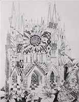 Angela Reggiori"Un omaggio a mio papà Albino", firmato Angela Reggiori. Una cattedrale, acquaforte su zinco, proprio una di quelle cattedrali che Albino Reggiori ha ripetutamente ripreso nella sua lunga carriera, gotica, slanciata, prestata alla sua perizia di calligrafico della materia; e un rosone in bell'evidenza e in primo piano, fiori e sintetizzare natura e opus dell'uomo, come anche nell'ultimo affresco voluto per Arcumeggia.