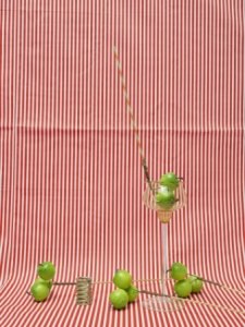 Il registro estetico della Kelm si caratterizza attraverso la scelta di sfondi animati, come in ”Apples”, dalla verticalità di fitte linee rosse e bianche con alla base miniature di mele acerbe, messe li con tocco naturale.