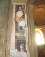 Affresco con San RoccoLa sorpresa – Benché i lavori di risanamento delle pitture della cappella dedicata alla Madonna – co-finanziati da parrocchia e comune – inizieranno più tardi rispetto a quelli in corso, i saggi di pulitura, per meraviglia di quanti vi stanno lavorando, hanno riportato alla luce splendide decorazioni in finto marmo al di sotto dell'attuale decorazione parietale e due affreschi lungo le pareti di imposta dell'arco d'ingresso, raffiguranti San Sebastiano e San Rocco. Dipinti che, secondo la Sovrintendenza, dovrebbero risalire ad un periodo immediatamente successivo al 1527 ed appartenere a qualche maestro della scuola di Bernardino Luini. Se il rifacimento ha interessato buona parte delle decorazioni novecentesche della parrocchia, i due affreschi ben conservatisi saranno invece oggetto di restauro conservativo, come indicato dal Sovrintendente.