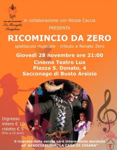 Busto – Giovedì 28 novembre al teatro Lux di Sacconago La Famiglia Sinaghina organizza lo spettacolo musicale “Ricomincio da Zero” un tributo al grande cantante. Il ricavato della serata sarà devoluto a favore dell’Associazione la Casa di Chiara. I biglietti (costo 10 euro) potranno essere prenotati ed acquistati alla sede della Famiglia Sinaghina, (Piazza Carlo Noè 1)oppure da Cartè, in via Padre Reginaldo Giuliani 5 e Rig House, in via Magenta 50. Inizio spettacolo ore 21.