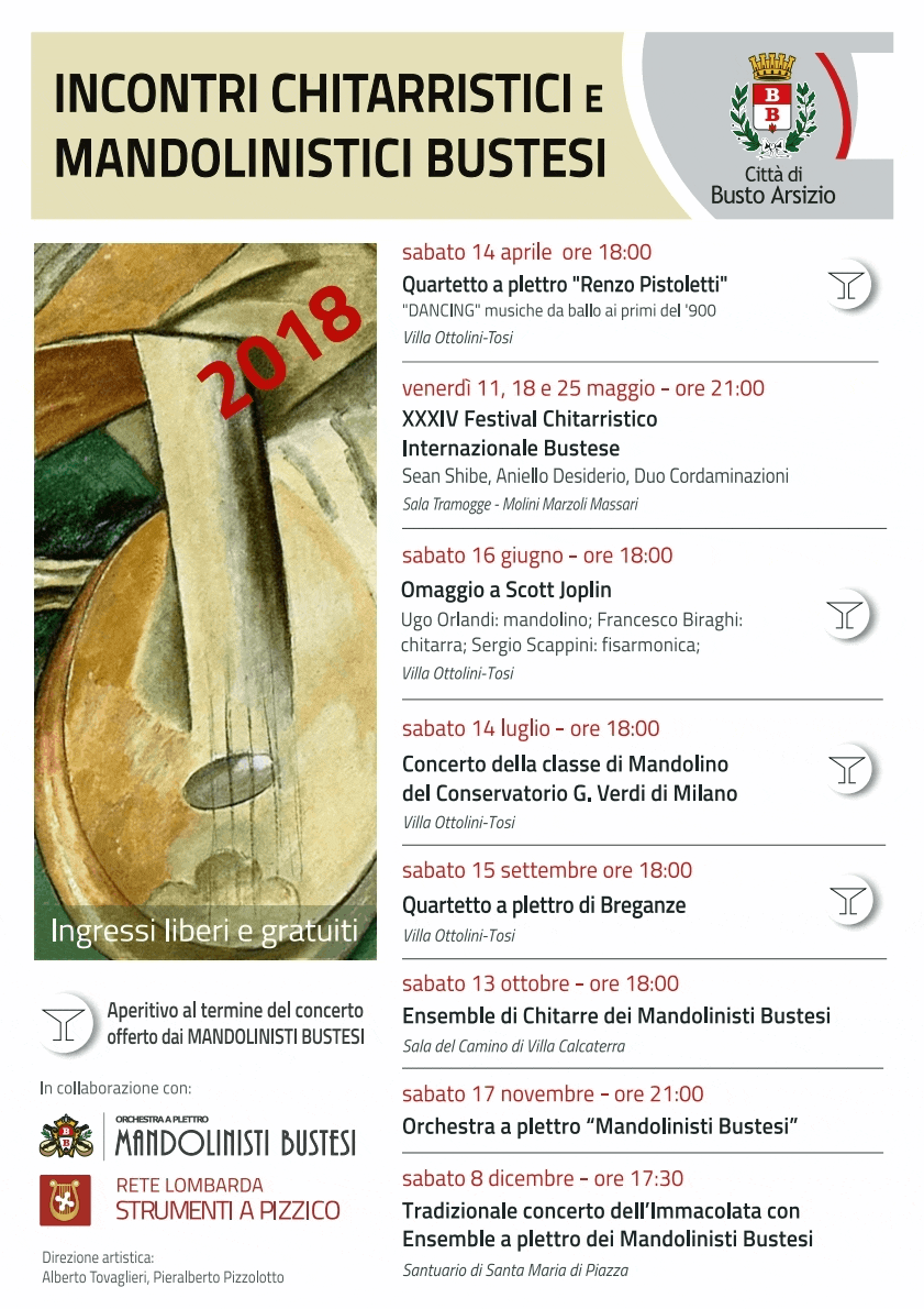 Busto Arsizio- Proseguono sabato 13 ottobre alle 18 nella sala del Camino di Villa Calcaterra gli Incontri chitarristici e mandolinisti bustesi. Il nuovo appuntamento è con l’ensemble di chitarre dell’Orchestra a plettro Mandolinisti Bustesi Il gruppo è composto da musicisti che collaborano stabilmente con l’orchestra e che provengono da diverse esperienze musicali e percorsi didattici.Il programma prevede musica e autori spagnoli che nei secoli hanno composto brani memorabili per la chitarra classica. Via Magenta, 70, ingresso libero e gratuito.