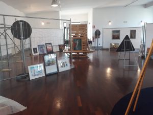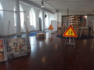 Ecco appunto, si diceva trasformare un problema in un’opportunità. E che opportunita! Per l’allestimento gli artisti del Cab hanno creato una sorta di cantiere, una grande installazione che raccoglie le oltre 80 opere esposte tra quadri, sculture ceramiche e lavori in vetro realizzati dagli artisti del gruppo. Così, ponteggi, cartelli, transenne, pallet segnano percorsi favorendo e guidando la visita alla mostra.