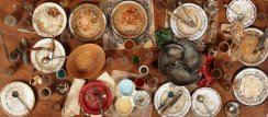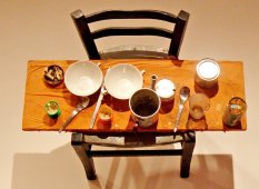 Ristoranti reali, o forse virtuali, in cui gli oggetti, bloccati su una tela, rappresentano la quotidianità, la semplicità insita nel pasto, ma anche la sacralità di cui è portatore. Cibo, ma anche modo di cucinare il cibo: le istallazioni di Spoerri presentano utensili diversissimi, raccolti nei mercatini di mezza Europa, che raccontano modi e tradizioni culinarie differenti, segno di tempi andati, ma proiettati verso il futuro.