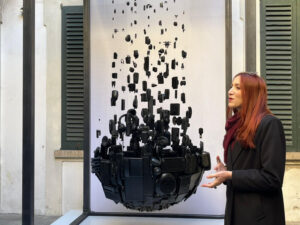 Al centro dell’installazione prende forma un pianeta compatto di RAEE che progressivamente si espande in una costellazione di oggetti, simbolo di un’evoluzione possibile: quella che porta “dallo scarto alla possibilità”, come sottolinea la stessa artista. Materiali spesso dimenticati nei cassetti delle case vengono così recuperati e reinterpretati, acquisendo un nuovo valore simbolico e ambientale.