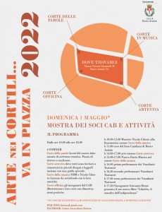 La piazza sarà suddivisa in 4 “Corner” tematici, all’interno dei quali si svolgeranno le attività. Oltre alla postazione “Corte delle parole”, punto di ritrovo e confronto per gli artisti e i visitatori, con esposizione dei lavori svolti dagli allievi del laboratorio di scrittura, si potranno visitare “Corte Arteviva” dove, dalle 14 alle 17, il pubblico potrà creare un’opera. Chi volesse cimentarsi in piccoli lavori di disegno o pittura qui troverà una indicazione nella “lettura” del proprio elaborato.