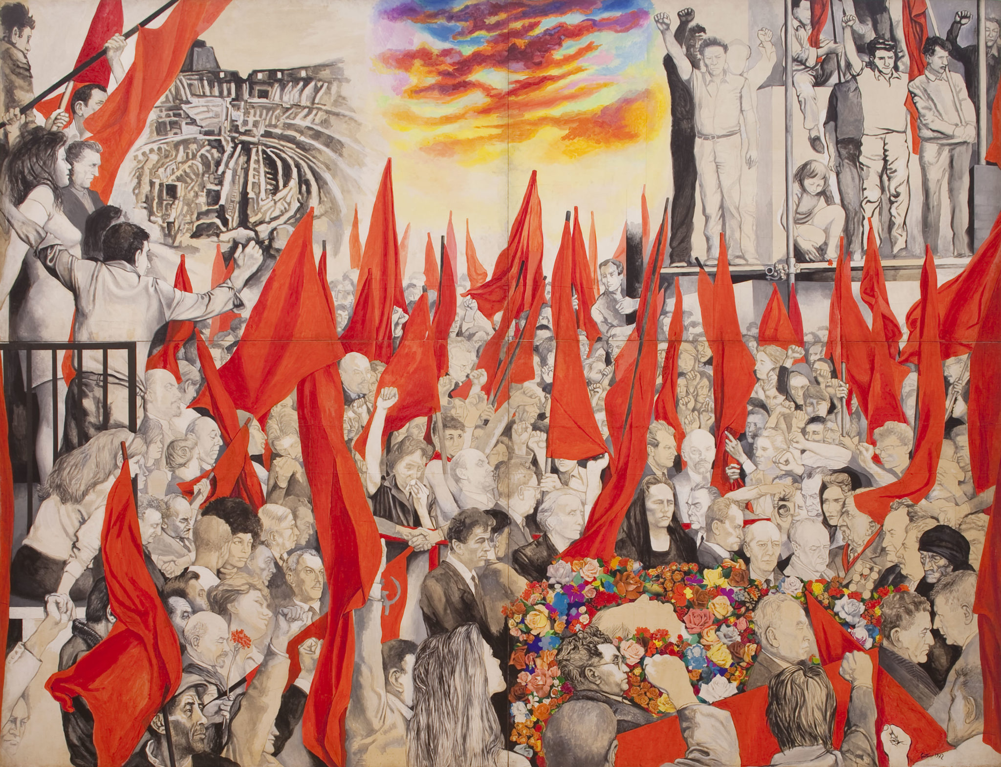 L’opera, profondamente corale, realizzata con tecnica mista su tavola nel 1972, per rendere omaggio al capo indiscusso del Pci, scomparso nel 1964, è custodita al Museo d’Arte Moderna di Bologna, nella sezione della collezione permanente denominata «Arte e ideologia». Il funerale, che si era svolto a Roma (a sinistra spicca il Colosseo, simbolo della città), è fuori dal tempo, immortalato iconicamente e narrato con evidente sfalsamento degli spazi e della prospettiva. Al centro, il cielo è infiammato, sulla destra, Renato Guttuso si autoritrae con il pugno alzato, mentre le bandiere, senza vento, assumono un ritmo astratto ma mantengono il colore rosso acceso, contrapponendosi, con forza, ai grigi e ai bianchi sui volti dei partecipanti: donne, uomini, contadini, operai, impiegati, emigrati, studenti, intellettuali, e tutte le personalità che hanno reso grande il movimento comunista, mescolate le une accanto alle altre in un abbraccio tra generazioni. Suggestivo anacronismo giustificato dalla certezza che le idee superano la morte e gli ideali sopravvivono agli uomini.