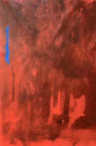e dolore . Dice l’artista: “rappresenta l’energia che tutti noi abbiamo dentro. Questo quadro, più di tutti, racchiude più contrasti e significati. Dal sangue, al colore dell’ inferno, al fuoco, … al Sacro cuore di Gesù Cristo”. Conflitti che proseguono diventando più nitidi nello squarcio azzurro che si apre tra i rossi e che va a stemperare ed a acquietare quello che il fuoco ha acceso….
