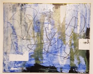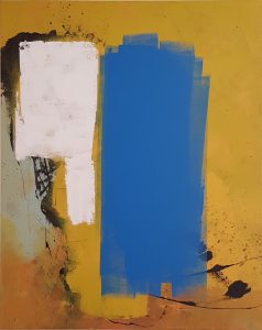 accomunate dalle gamme dei gialli e dei blu. Qui, soprattutto evidenti negli ultimi lavori, risalta l’utilizzo dei rulli. “Spalmate” di colore, come l’artista stesso le definisce, per ottenere effetti che nè spatola nè pennello riuscirebbero a dare. La consistenza da densa e piena via via si assottiglia andando a sfumarsi e originando risvolti metamorfici e uno stacco netto con il colore accanto… Mentre le immancabili gocciolature attraversano ed entrano in contrasto con la narrazione compositiva.