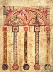 Libro di Kells, tavola dei Canonirinascita dell'ornamento celtico che assieme a quello teutonico-zoomorfo creò un nuovo vocabolario di forme e principi decorativi nati nell'ambito della lavorazione dei metalli e quindi sviluppati ora su un nuovo supporto.