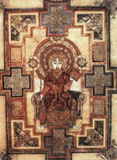Libro di Kells, Evangelista Giovannialtomedievale, a lungo conservato presso la chiesa di San Colombano, ossia il Codice Kells. Si tratta di un libro con i Quattro Vangeli canonici. Si pensi che per la sua realizzazione occorsero le pelli di circa 180 vitelli che servirono per creare i 340 fogli dell'opera (Otto Pӓcht, La miniatura medievale). Nel codice le tavole dei Canoni sono collocate entro architetture tradotte in forme semplici e riempite da decorazione di chiara matrice celtica.