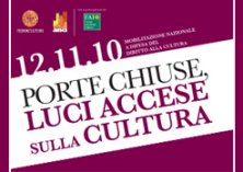 "Porte chiuse, luci accese sulla cultura" è il nome dell'iniziativa promossa da Federculture e ANCI (Associazione nazionale dei Comuni Italiani) per venerdì 12 novembre 2010. Decine di città, musei, teatri, hanno aderito a questa iniziativa che mette in evidenza il drammatico momento che stanno vivendo le politiche culturali nel nostro Paese. Federculture (www.federculture.it) ed ANCI, con la partecipazione del FAI, promuovono una mobilitazione nazionale a difesa del diritto alla cultura per sensibilizzare il Paese sugli effetti della manovra finanziaria sul settore della cultura. Tutto il sistema culturale e della conoscenza, dalla scuola alla università, dai teatri ai cinema, dai media ai musei, dal patrimonio artistico alla cultura diffusa, stanno subendo un attacco senza precedenti.