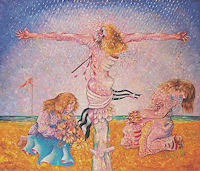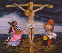 Crocefissione, acrilici su tela, 1993Al centro, l'espressione e il movimento – La sua è una personale commistione della drammaticità visionaria di Matthias Grünewald e del dinamismo deformante alla Hieronymus Bosch. E pare che anche a lui si possano cucire addosso le parole che già H. A. Schmid riferì all'inizio del XX secolo, proprio al grande maestro nativo di Würzburg: "All'artista non interessano che l'espressione e il movimento. La norma, la misura, le proporzioni della figura umana non lo hanno certamente interessato molto. Le sue forme fisiche sono per lo più brutte, malaticce, impossibili o almeno fuori dall'ordinario, anche quando non si sacrifichi niente all'espressione. I volti sono asimmetrici, quasi in ogni dipinto si riscontrano arbitrii di disegno che hanno una giustificazione artistica; oppure tralascia il modellato, come avviene negli schizzi. Già questo fatto, e l'arbitrarietà delle proporzioni, dimostrano che l'artista non si è lasciato turbare da ciò che è anormale". L'artista in questione è Benito Trolese nato nel 1937 a Venezia e ospite, con numersoi lavori, fino all'11 aprile nella chiesa di San Carlo a Germignaga.