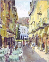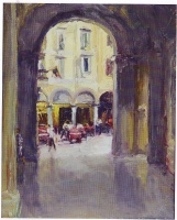 Un'altra opera in mostraseconda delle ore del giorno. Krigar sceglie con cura i suoi soggetti e si ritrova spesso a ritrarre le architetture che si aprono verso un cortile o una strada. Gli archi creano così una sorta di nuova cornice che suggerisce maggior fascino alla scena.