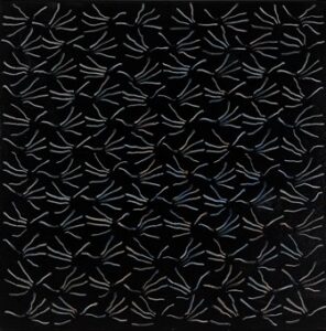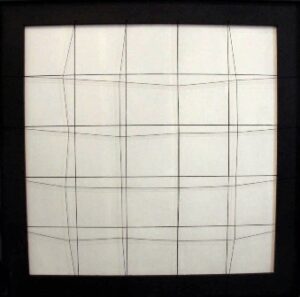 “Spazio elastico – 8 linee nere” di Gianni Colombo (1974 – legno dipinto, chiodi e elastici su tavola) armonizza attraverso le trame di quadrati, l’elasticità di un contesto a sua volta a forma quadrato, sfasamenti lineari atti a creare moti elastici tra le varie dinamiche spaziali.
