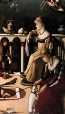 Le ambiguità del dipinto, da incentrarsi, come visto, nell’uomo in secondo piano, hanno fatto sorgere alcuni sospetti che la donna ritratta sia in verità una cortigiana. La cosa venne legata alla città libera e mercantile di Venezia che fu dal Cinquecento al Settecento una roccaforte di queste donne. Una importante testimonianze di quanto detto ci viene fornito dallo scrittore Pietro Aretino (1492/1556) nei famosi Dialoghi delle corti. In verità sappiamo ben poco di com’era in realtà l’esistenza di coloro che avevano deciso di guadagnarsi da vivere in questo modo. Nella seconda metà del XVI secolo visse a Venezia Veronica Franco, una fra le più famose rappresentanti di questa corporazione e al tempo stesso celebre letterata. Nelle sue lettere e poesie ci informa anche sui suoi sentimenti. Essa si presenta come una donna intelligente e cordiale, capace di esprimere un’autentica passione per la vita. Osservando il suo ritratto, comparso per la prima volta nel 1576 come antiporta delle sue Terze Rime, notiamo l’eleganza dell’abito particolarmente lavorato che ben si confà all’eleganza del suo volto, e che difficilmente avrebbe potuto distinguersi dalle donne patrizie che allora giravano per la Repubblica Serenissima.