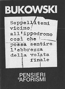 Irriverente, ironico e autoironico, dissacrante nei confronti della morale buonista tanto al chilo, perdente non sempre per scelta esistenziale, infastidito dai luoghi comuni come dall’impostura dei buoni sentimenti, questo e molto altro si può trovare in “Bukowski. Pensieri e aforismi” (Stampalternativa, pp.28. Euro 1,03) con prefazione di Paolo Roversi.