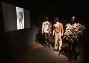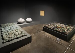 in poliuretano espanso percorribili dai visitatori. La disumanizzazione degli individui è rappresentata da anonime fisionomie di alcuni manichini dove la sagoma femminile è rivestita da un primordiale panno costellato di sassi.