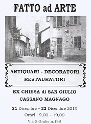 Nasce così la mostra di Cassano Magnago, in programma per sabato 21 e domenica 22 dicembre, in cui restauratori e decoratori mostreranno al pubblico le loro preziose opere. Il tutto in un contesto veramente eccezionale, la ex chiesa di S.Giulio di Cassano Magnago: non sempre aperta al pubblico, merita senza dubbio una visita per i suoi affreschi e per i resti archeologici visibili, messi in luce in uno scavo archeologico guidato dalla compianta dott.ssa Binaghi, funzionario della Sovrintendenza.