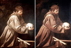Un po' di storia, please – Ma veniamo alle opere in mostra a Masnago. Stesso supporto (olio su tela), misure praticamente identiche, medesimo soggetto iconografico: San Francesco in meditazione, vestito di un povero saio. Le due opere sembrano identiche, eppure ad uno sguardo più attento le differenze si notano: alcune sfumature, il taglio della luce e il trattamento del panneggio differenziano i due quadri, forse distanti anche sotto l'aspetto della paternità artistica. Secondo la restauratrice e studiosa Rossella Vodret, infatti, solo una tela appartiene al grande maestro della luce, mentre l'altra rientrerebbe nella cerchia dei cosiddetti autori "caravaggeschi". Altri autorevoli studiosi, tuttavia, sostengono tesi diverse, con motivazioni scientifiche altrettanto fondate.