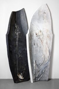 Gabriella Benedini lavora il legno come materia archetipica, portatrice di un vissuto che l’artista non cancella ma trasforma. Spesso provenienti da materiali di recupero, come i fasciami di barche, le sue sculture conservano le tracce del tempo. Nelle opere Vele (2024–2025), una nera e una bianca, il legno si apre a una dimensione simbolica e spirituale, evocando il viaggio interiore, la trasformazione continua e l’armonia tra opposti.