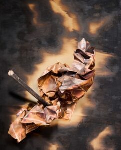 Il rame è il materiale elettivo di Pietro Coletta, scelto per il suo valore simbolico e alchemico. Attraverso bruciature, ossidazioni e accostamenti con altri materiali, l’artista indaga il rapporto tra luce e ombra, materia e trascendenza. Opere come Soglia, Dardo di Zeus e Incanto si configurano come luoghi di passaggio, portali simbolici tra il visibile e l’invisibile.