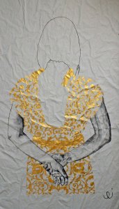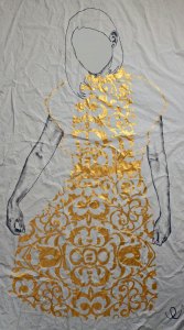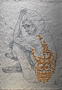 300 fotografie, veri e propri studi preparatori ai dipinti. Nelle opere emerge sempre qualcosa di distintivo: i tatuaggi di Daniela sono svelati uno alla volta. Ogni dipinto ha previsto almeno tre revisioni. In alcuni lavori il viso viene solo accennato, perché la scelta è quella di porre l’accento su altri particolari come le mani o l’abito damascato. La tecnica esecutiva adottata prevede l’utilizzo di tela grezza ricoperta da una mano di malta bianca, realizzata da me. Si tratta di una malta al quarzo, ottenuta con polvere di quarzo, colla e tinta bianca acrilica. Dopo una prima spatolata che essicca in circa dieci ore ho dato una mano di grigio, ho realizzato il disegno a carboncino e per creare i rilievi dorati ho adoperato una siringa sterile.