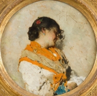 Lavorare con foga nelle vie moderne di Parigi – Che sia un artista di valore se ne accorgono in molti e subito. Ma non è questo il punto; il successo di Giovanni Boldini deriva anche dall'essere entrato subito in sintonia con il gusto del momento, dall'aver intuito e soddisfatto con la sua pittura il desiderio di un pubblico che dall'America viene a cercare nella Ville Lumière briciole di sogno. Ecco a voi la "Giovane davanti a una porta-finestra", ritratta in un abito cangiante che ne castiga la figura minuta ma piacente. L'opera – uno strepitoso olio su tavola – è stato anche esposto alla memorabile mostra: "Boldini, Helleu, Sem. protagonisti e miti della Belle Epoque" del 2006.