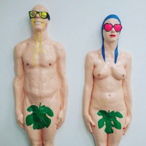 La cromia delle due sculture contribuisce a farle percepire come un tutt’uno con la parola enunciata. Il senso dell’opera si sviluppa in egual misura attraverso le due parti di cui è costituita: testuale e scultorea. Nella continua ricerca di una coerenza fra immagine e linguaggio. Adamo ed Eva rappresentano l’essenza dell’uomo e della donna, ne richiamano le radici, diventando così una forte icona capace di creare link diretti fra testo e immagine.