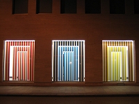B.S.I. , opera di D. Buren"Art at work" – Lo sconfinamento delle opere d'arte dai luoghi tradizionali di conservazione è da intendersi anche come collocazione delle stesse in spazi chiusi che non siano musei. Ce lo spiega Simona Motta, riportando l'esempio della BSI (Banca svizzera italiana) con sede a Lugano in Via Canova 6. Ristrutturata dall'architetto Camponovo che ha imposto linee semplicissime a un edificio ottocentesco, è ora spazio museale, oltre che sede bancaria. Gli artisti L. Gillick, J. Armleder, R. Barry e D. Buren sono stati selezionati per creare opere che tenessero in considerazione le funzioni della banca, la clientela, i passanti, la città di Lugano, caratterizzandosi quindi come site specific, mettendo in atto una vera rete di interconnessione e soprattutto stravolgendo il tradizionale rapporto contenuto-contenitore. Le opere comunicano con chi entra nella banca, con chi ne è fuori e con il lago e la città di Lugano.