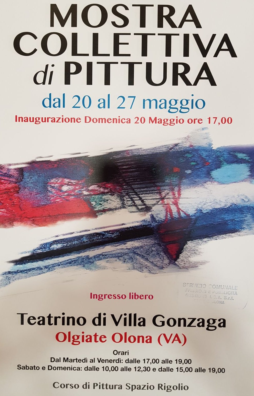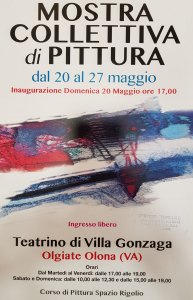 Al Teatrino di Villa Gonzaga a Olgiate Olona si inaugura domenica 20 maggio alle 17,00 la mostra collettiva degli allievi del corso di pittura dello Spazio Rigolio, tenuto dal maestro Gaetano D’Auria. Dal 20 al 27 maggio 2018, dal martedì al venerdì dalle 17,00 alle 19,00, sabato e domenica dalle 10,00 alle 12,00 e dalle 15,00 alle 19,00.