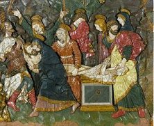 I maestri ritradussero il modello nelle varie tecniche, tra cui in questi straordinario rilievo ligneo di fine quattrocento proveniente dal Sacro Monte, in cui la classica solennità della stampa appare declinata nei toni di una più accentuata temperie affettiva e devozionale, uniti ad una intensa cromia.