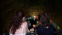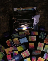 Tra art terapy-public art – Dopo un'interattiva ambientazione elettroacustica e site specific dell'amico Pietro Pirelli, maestro di armonie bruitiste ed olistiche suggestioni paleorganologiche shaferiane e sachsiane, ecco i "Dialoghi sul filo dell'acqua… – memorie acquatiche in cristalline e solitarie trasformazioni", a cura di Grazia Giani (maieuta steineriana) & C. (il "suo" clan): un'operazione tra art-terapy (socializzazione artistica) e public-art (arte sociale), con la pittura a fare da transfert tra la Grazia da Besozzo (pittrice essa stessa e socia d'una locale associazione artistica diretta dall'amico Marcello Morandini) ed un gruppo nutrito ed assortito di ben 27 C., quasi tutte al femminile, nelle tre ovoidali "camere del ghiaccio"; dove, nelle viscere di quella maggiormente conservata, un gestuale lavoro della Giani, à la Paul Jenkins, – egocentrico per dimensioni ma egoeccentrico per collocazione – campeggia su uno stuolo di carte cromatizzate (tra le quali alcune, senza saperlo, naiveggiano per "immagini potenziali" un pre-kandinskiano M.K.Ciurlionis…), deposte là dove un tempo si ricoprivano le lastre di ghiaccio con la pula del grano e le stuoie di cannucce palustri per coibentarle onde conservarle nel tempo insieme al pescato.