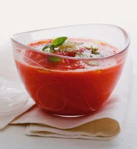 Il Gazpacho può essere definita a pieno titolo una zuppa di verdure che originariamente si preparava solo con pane raffermo, olio ed aceto. Solo in seguito vennero inserite nella ricetta base verdure e pomodoro. Si tratta di un piatto molto estivo, fresco e leggero, perfetto in tutte le diete, estremamente benefico per la salute grazie alle sue proprietà. In genere viene servito freddo, come aperitivo o in accompagnamento ad altri piatti, ma è ottimo anche