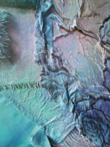 L’esposizione di Cairate porta in scena quadri, arazzi, tappeti, pannelli di seta, oggetti rivestiti, in cui confluiscono suggestioni diverse: dai tessuti d’arredamento provenienti da scarti e campionari, a fibre recuperate di vario genere, a stucchi, gessi, e altri componenti di riciclo.