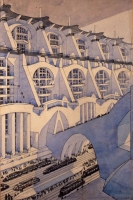 V.Marchi, 'Città ', 1919 ca.Eredità artistiche – In mostra il prima e il dopo del Futurismo, che, a volerlo inglobare temporalmente, lo si può fare tra il 1909 e il 1944, andando ad esaurirsi con la morte di Marinetti. Un movimento che fu vitale per un trentennio, nel corso del quale coinvolse e spaziò in tutta la società del tempo. "Non può sussistere pittura senza divisionismo", affermavano i cinque promotori nel 1910; da qui, un percorso espositivo che muove dalla fine dell'800 con i protagonisti del Simbolismo, e del Divisionismo, da Alberto Martini e Romolo Romani, da Medardo Rosso a Gaetano Previati. Una scansione temporale precisa, decennio dopo decennio, a partire dalla coscienza di un nuovo ideale di bellezza e una nuova pulsione vitale: dinamismo e velocità. Gli anni dieci e il dinamismo plastico, a cui fa seguito, nel decennio successivo l'interesse per l'arte meccanica. 'L'epoca in cui viviamo (…) si distinguerà fra tutte nella storia per la divinità che vi impera: la Macchina', è solo uno dei pensieri espressi ne L'Arte Meccanica, specifico Manifesto del '23. Si solcano nuovi orizzonti, si aprono nuove prospettive, sono gli anni Trenta quando nasce L'Aeropittura: 'Il Colosseo visto da 3000 metri da un aviatore, che plana a spirale, muta di forma e di dimensione ad ogni istante', si leggeva nel Manifesto del 1929. Ogni settore, ogni sfaccettature dell'esistenza umana viene indagata, viene descritta, viene resa pubblica. In architettura furono i progetti di Sant'Elia, il manifesto di un nuovo ideale di città, con nuovi materiali di costruzione. Gettate ormai le basi di una nuova concezione di spazio e di materia, si muovono negli anni seguenti alcuni protagonisti del '900 artistico mondiale, da Burri a Fontana, presenti con alcuni pezzi in mostra.
